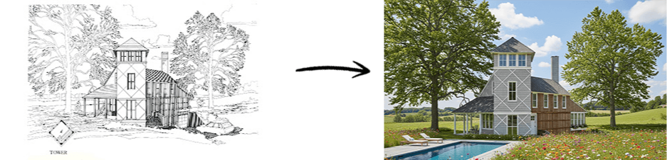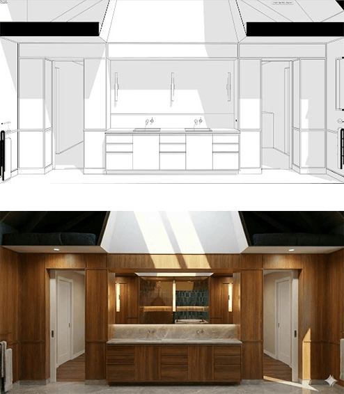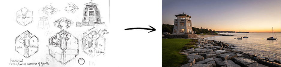 The AI doesn’t care about artistic talent. It reads geometry, proportion, and spatial logic, the things you put into a sketch without even thinking about it. A rough line that captures a ceiling height. A scribbled curve that suggests a canopy. A few strokes to separate glass from stone. That’s what it uses.