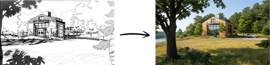 It starts with a sketch: fast, simple, proportionally accurate. Not a finished drawing. Just enough to communicate the idea. That sketch, coupled with your prompts, controls the AI. The image it generates follows your direction.